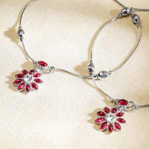 Oxidised Silver-Plated Ruby Pink & White Kundan Studded Floral Charm Anklet Set of 2 for Women