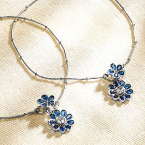 Set of 2 Oxidised Silver-Plated Blue Kundan Floral Charm Anklets
