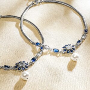 Set of 2 Oxidised Silver-Plated Blue & White Kundan Stone Anklets with Pearl Accents