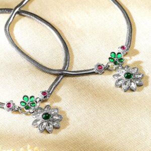 Set of 2 Oxidised Silver-Plated Ruby Pink & Emerald Green Kundan Stones Floral Charm Anklets