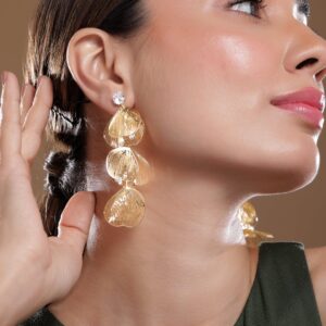 Gold-Plated Wire Mesh Layered Petal Dangle Earrings with Crystal Studs – Gold