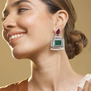 Oxidised Silver Plated Ruby Pink & Green Stone Studded with Pearl Beads Statement Earrings – Silver
