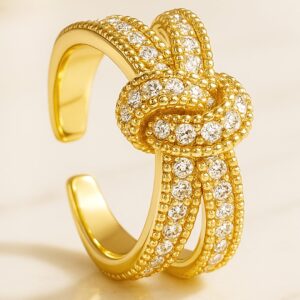 18K Gold-Plated Brass Cubic Zirconia Studded Bow Design Adjustable Finger Ring