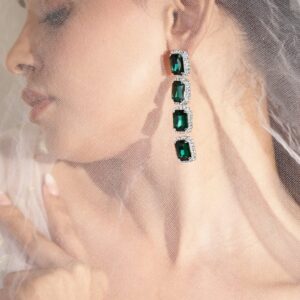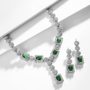 Rhodium Plated Emerald Cut Crystal & CZ Studded Jewellery Set – Green