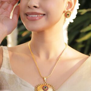 18K Gold-Plated Pendant Set with Textured Floral Frame and Green & Ruby Pink Stones
