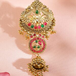 18K Gold-Plated Ruby Pink & Emerald Green Stone Studded Temple Braid Hair Accessory with Jhumka Drop