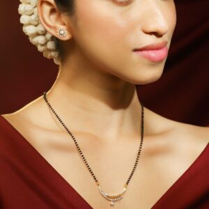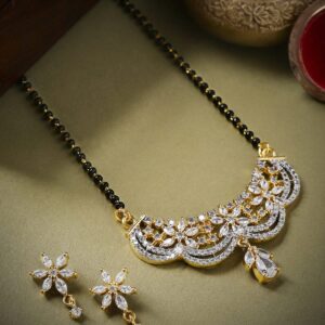 18K Gold-Plated White Cubic Zirconia Studded Curved Bar Mangalsutra Set with Black Beaded Chain & Earrings – Gold