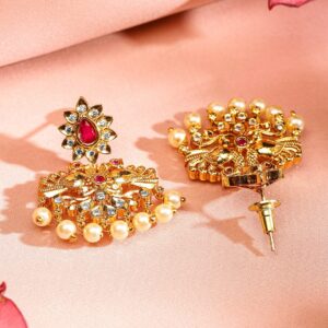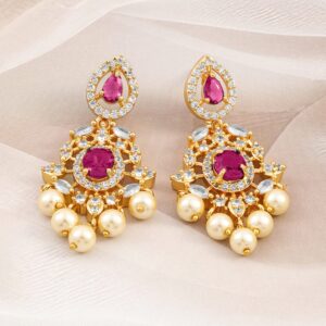 22 Kt Gold-Plated Ruby Pink & Cubic Zirconia Studded Chandelier with Pearl Drops – Gold