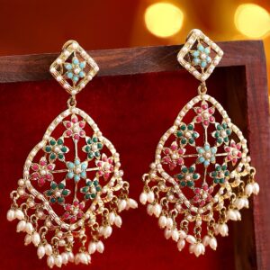 22K Antique Gold Plated Multi Colour Pearl Studded Statement Chandbali Earrings – Gold::Multi Color