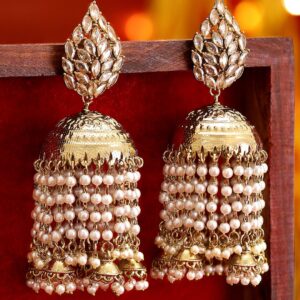 18K Gold Plated Kundan Work and Off-White Pearl Beaded Handcrafted Big Chandelier – Gold
