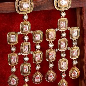 18K Gold-Plated Kundan & Glossy Cream Pearl Beaded Handcrafted Long Chandelier Earrings – Gold