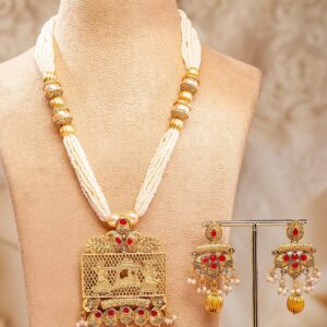 22K Gold-Plated Ruby & White Pearl Beaded Multistrand Temple Motif Jewellery Set – Gold