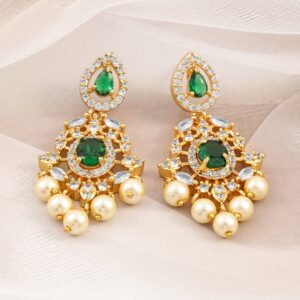 22KT Gold-Plated Emerald Green & Cubic Zirconia Studded Chandelie with Pearl Drops – Pastel Pink