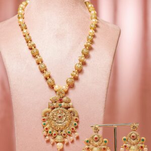 24K Gold Plated Ruby & Emerald Stones and Pearl & Golden Beads Temple Jewelry Set – Gold