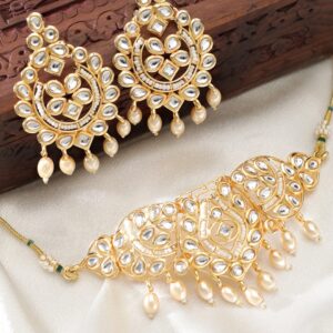 18K Gold-Plated White Kundan Studded & White Pearls Beaded Traditional Choker Jewellery Set – White