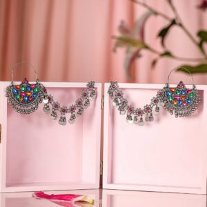 Oxidized Silver-Plated Multicolored Enamel Chandbali Earrings with Attached Ear Chain