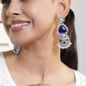 Oxidized Silver-Plated Purple Stone & Blue-White Beaded Statement Drop Earrings