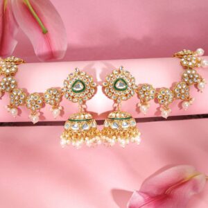 18K Mehandi Gold-Plated Kundan & Green Bead Traditional Chandbali with Pearl Accent – Gold