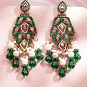 18K Gold-Plated Emerald Green Kundan & Pearl Studded Handcrafted Long Chandelier Earrings