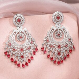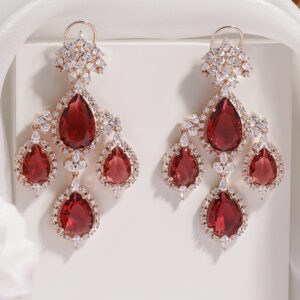 18K Gold-Plated Ruby Red & Cubic Zirconia Studded Premium Chandelier Earrings – Red