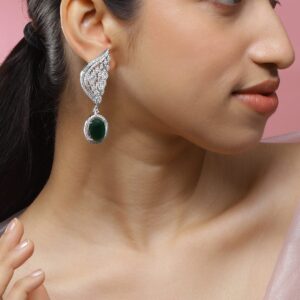 Rhodium-Plated Emerald Green & White Cubic Zirconia Studded Premium Drop Earrings