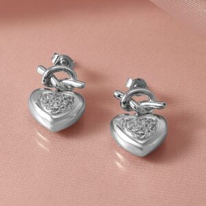 Rhodium Plated Heart Knot Design Cubic Zirconia Studded Drop Earrings – Silver