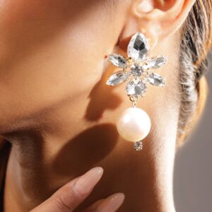 18K Gold-Plated Cubic Zirconia & Pearl Drop Floral Earrings – Elegant Statement – Gold