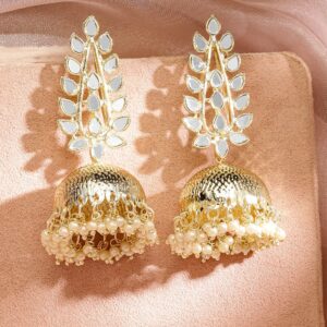 18K Gold Plated Mirror Studded & Pearl Beaded Traditional Jhumkas Earrings
