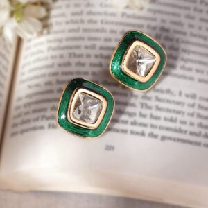 22K Antique Gold Crystal Studded Green Enamel Stud Earrings – Green::Gold