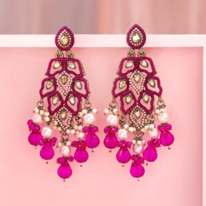 22K Gold Plated Pink Stone & Kundan Studded Chandelier Earrings with Pearl & Bead Accents