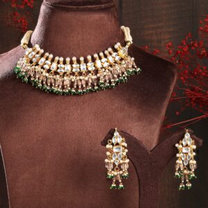 24K Gold-Plated Pachi Kundan Studded Choker Set with Champagne Beads & Green Accents