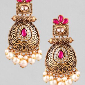 22K Antique Gold Plated Ruby Zirconia & Pearl Studded Statement Chandbali Earring – Gold::Pink
