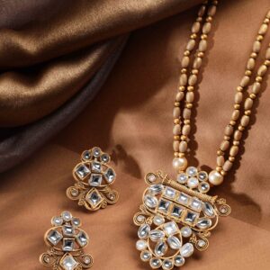 18K Gold Plated Handcrafted Kundan Studded and Gold & Pearl Beaded Jewellery Set – Gold