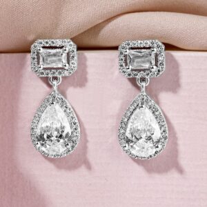 Rhodium Plated White Baguette Cubic Zirconia Studded Teardrop Earrings – Silver