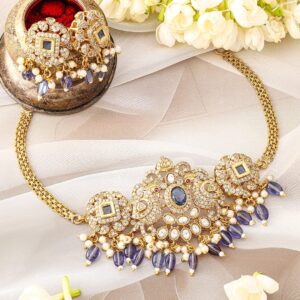 22K Gold Plated Blue Stone & CubicZirconia Studed Choker Set with Blue & Pearl Bead