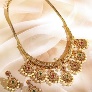 24K Gold Plated Ruby, Emerald & White Cubic Zirconia Stone Studded Handcrafted Floral Choker Jewelry Set – Green
