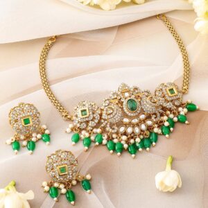 22K Gold Plated Emerald Green & Cubic Zirconia Choker Set with Green & Pearl Beads