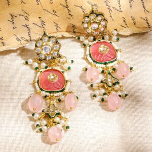 22K Gold-Plated Kundan Floral Studded Pink Carved Stone with Green & White Beaded Dangler Earrings