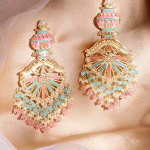 18K Gold-Plated Baby Pink Kundan & Pearl Studded Handcrafted Long Chandelier Earrings