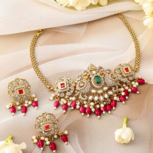 22K Gold Plated Ruby, Emerald & Cubic Zirconia Choker Set with Red & Pearl Beads