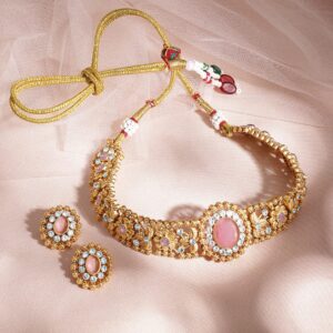 24K Gold Plated Handcrafted Pastel Pink & White Cubic Zirconia Studded Choker Set – Pink