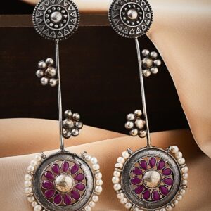 Oxidised Silver Plated Handcrafted Ruby Stone with White Pearls Drop Earrings – Silver