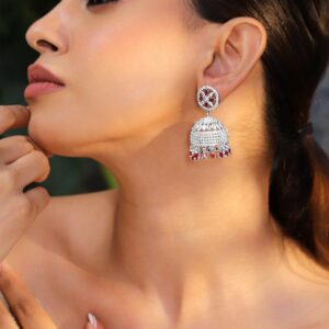 Rhodium Plated White Cubic Zirconia Studded Dome-Shaped Jhumka Earrings – Silver