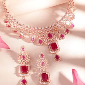 24K Rose Gold Plated Ruby Pink Sapphire & Cubic Zirconia Studded Handcrafted Premium Jewellery Set – Pink