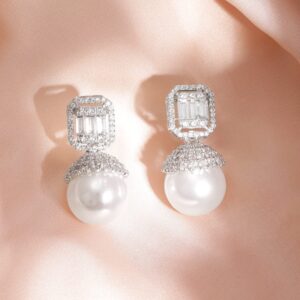 Rhodium-Plated Cubic Zirconia & Pearl Drop Earrings – Silver
