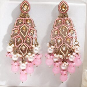 18K Gold-Plated Baby Pink Kundan & Pearl Studded Handcrafted Long Chandelier Earrings