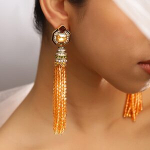 18K Gold Plated Citrine Yellow Beaded Tassel & Cubic Zirconia Long Dangle Earrings – Orange