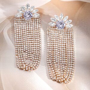 Rhodium Plated Silver Toned Cubic Zirconia Studded Contemporary Long Drop Earrings – Gold