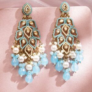 18K Gold-Plated Light Blue Kundan & Pearl Studded Handcrafted Long Chandelier Earrings