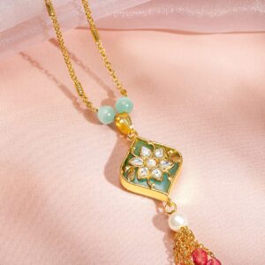 18K Gold-Plated Mint Green Enamel and Kundan Floral Pendant Necklace with Pearl and Ruby Pink Beaded Tassel